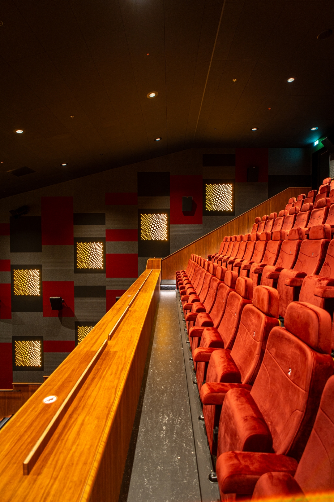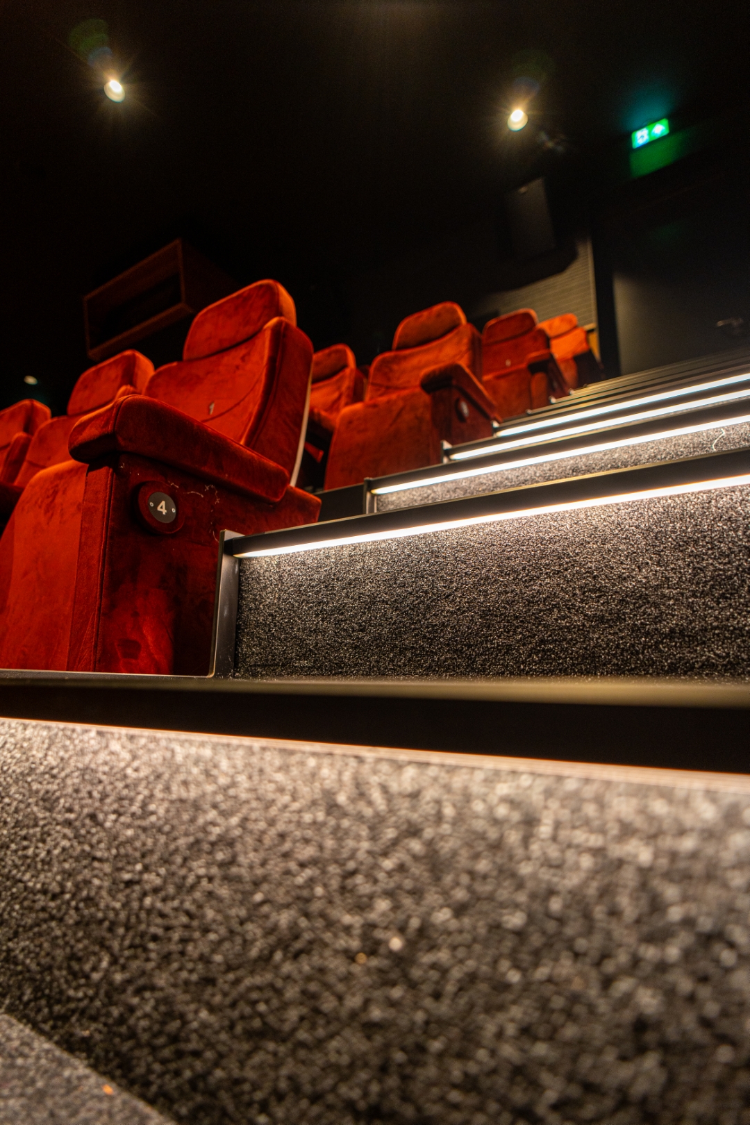 Een bijzonder onderdeel van dit project is de integratie tussen de bioscoopzalen en onze lichtbesturing. Wanneer een film start, communiceren de cinemaserver en het bedieningssysteem automatisch met elkaar. Hierdoor worden film, zaalverlichting en sfeerstanden volledig synchroon gestart vanuit één centraal systeem.