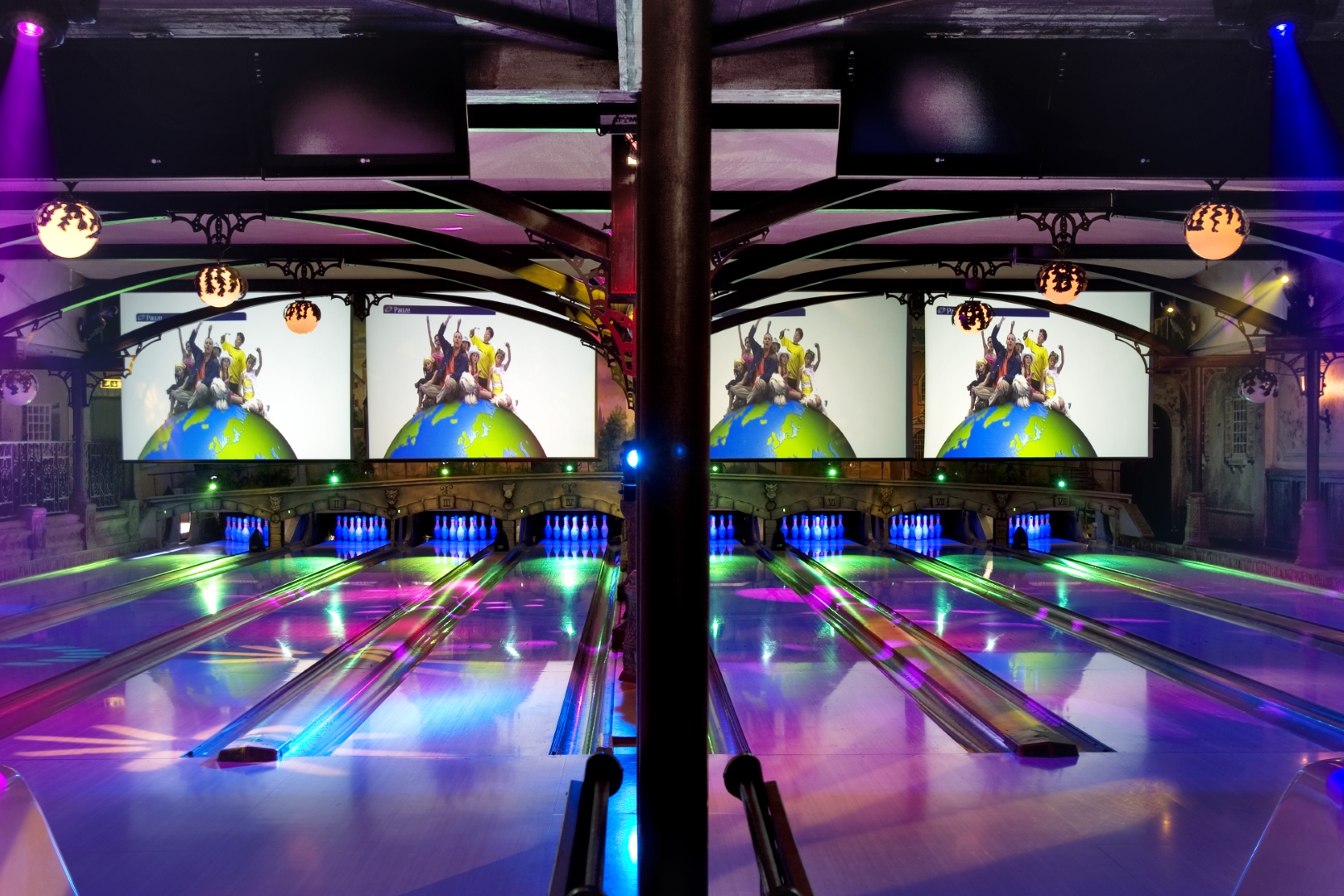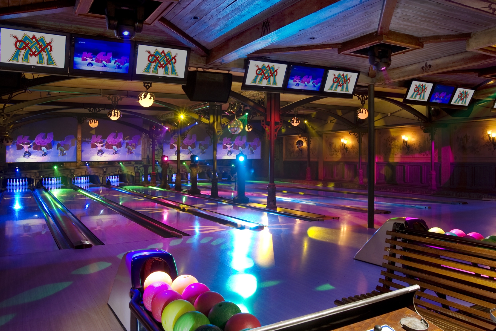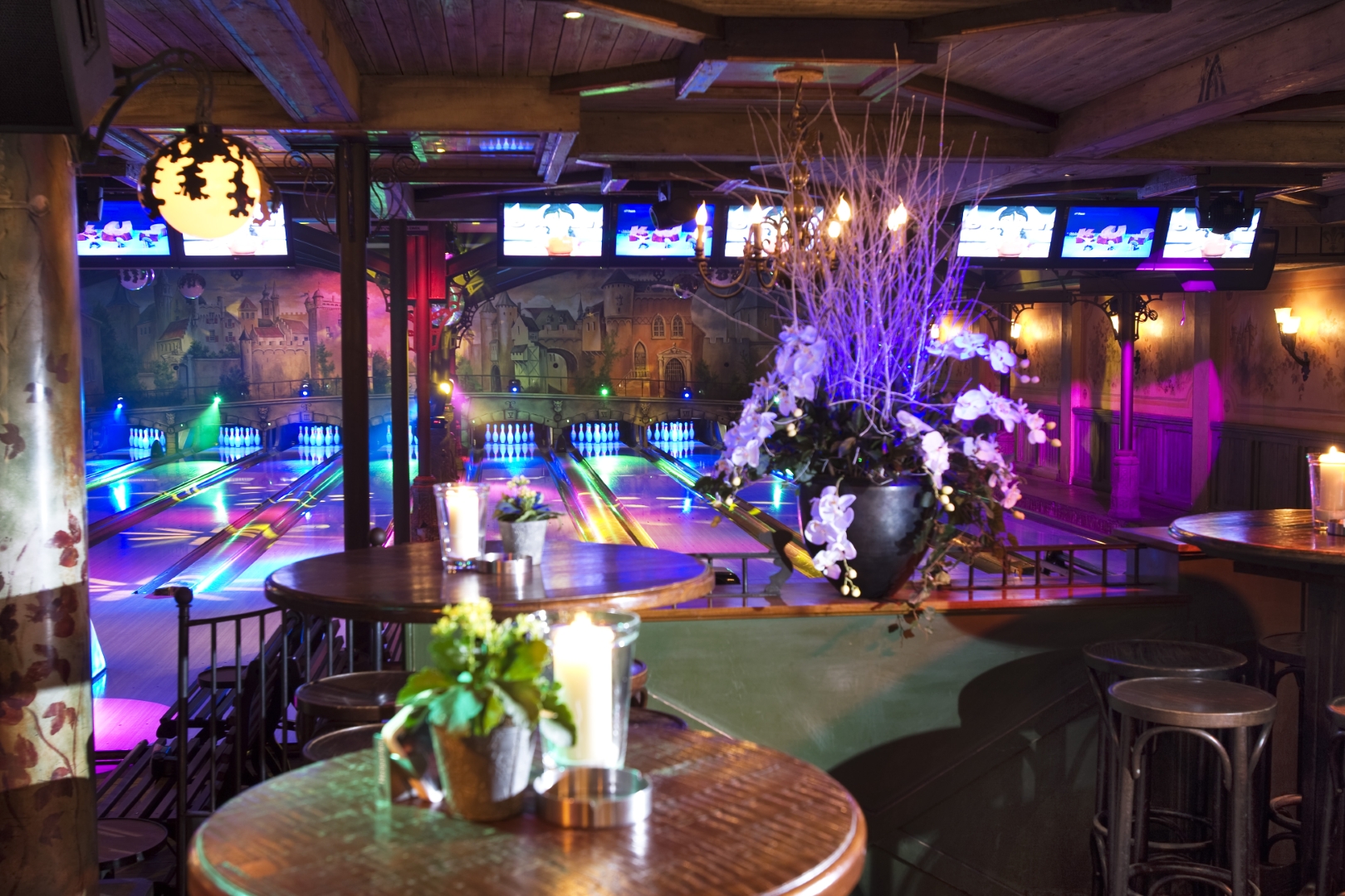 De showverlichting speelt een belangrijke rol in de totale ervaring. Door dynamische lichteffecten en kleurgebruik ontstaat er een levendige omgeving die perfect aansluit op de interactieve projecties en het spelelement van het bowlen.