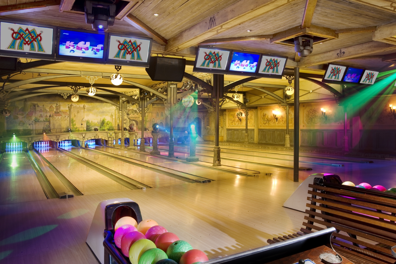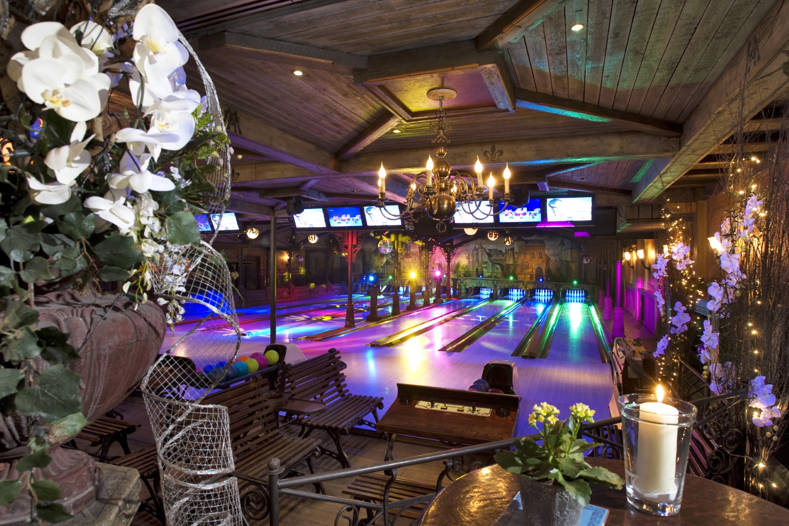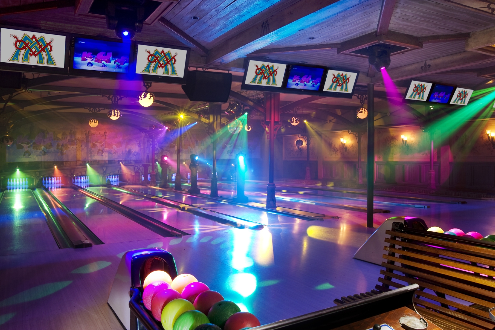 De showverlichting speelt een belangrijke rol in de totale ervaring. Door dynamische lichteffecten en kleurgebruik ontstaat er een levendige omgeving die perfect aansluit op de interactieve projecties en het spelelement van het bowlen.